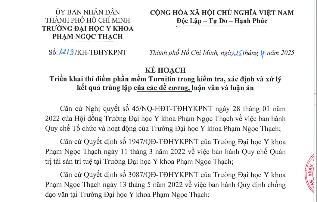 Kế hoạch triển khai thí điểm phần mềm Turnitin trong kiểm tra, xác định và xử lý kết quả trùng lặp của các đề cương, luận văn và luận án